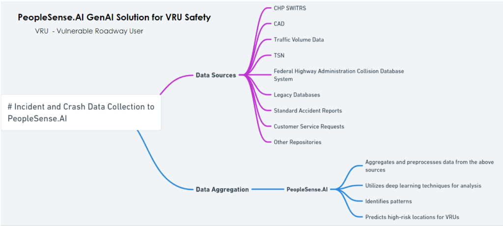 PeopleSense.AI system aims to identify high-risk areas for vulnerable roadway users, recommend safety measures, and facilitate infrastructure improvements by analyzing a comprehensive dataset derived from various transportation-related sources and leverage past relevant experiences of the proposing team.